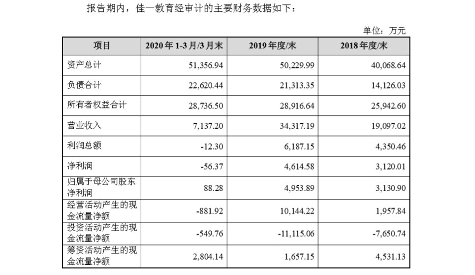 收购草案显示,佳一教育2018-2019年实现营收1.91亿元、3.43亿元,同比增长率约80%;实现归母净利润3130.90万元、4953.89万元,同比增长率约58%——营收与净利润增速均较亮眼。今年一季度,受疫情影响其实现营收7137.2万元、归母净利润88.28万元。