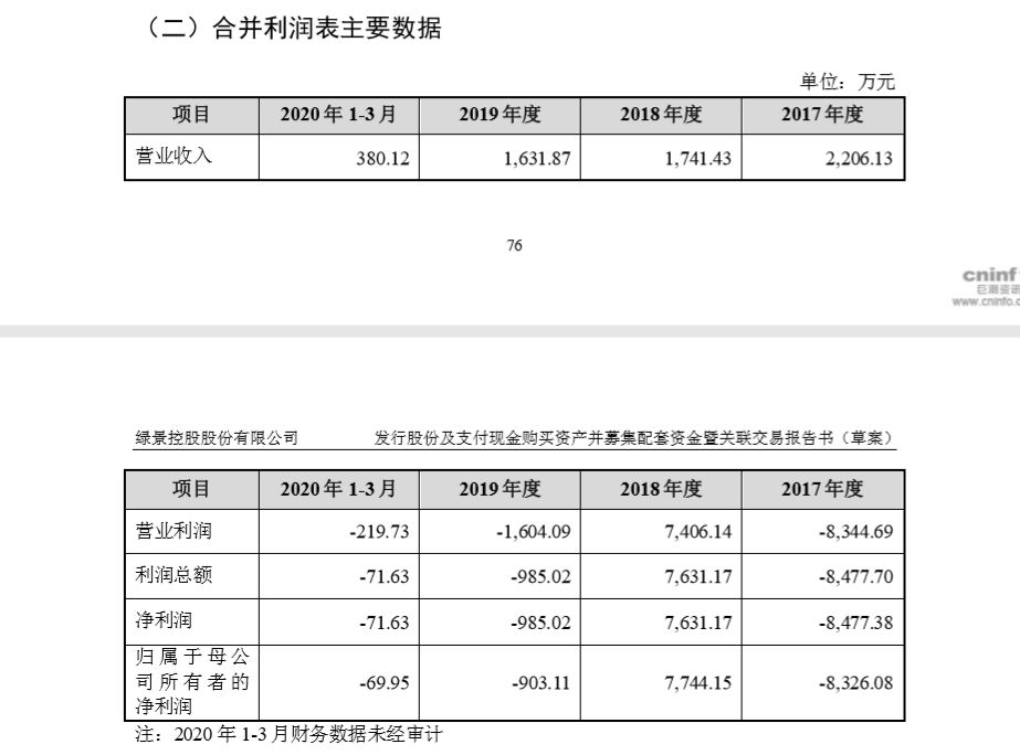 重组方案显示,绿景控股2017-2019年实现营收2206万元、1741万元、1632万元,同比增长率为-21%、-6%;实现归母净利润-8326.08万元、7744.15万元、-903.11万元。总的来看,公司发展情况并不理想,净利润波动幅度巨大。经营态势日趋下滑的绿景控股,亟需寻找新的盈利增长点。