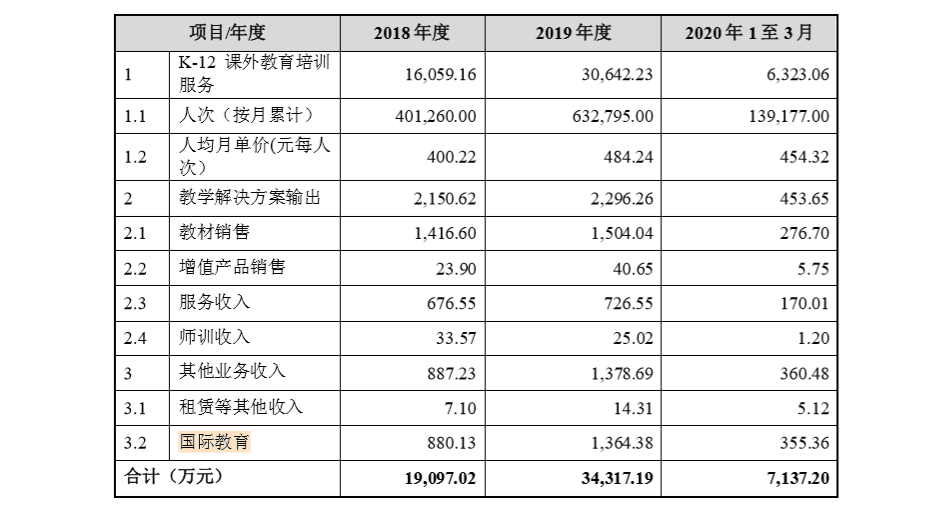K12课外教育培训服务为其最主要的业务。2018-2019年,课外教育培训服务业务收入为1.61亿元、3.06亿元,增长率为90.81%。