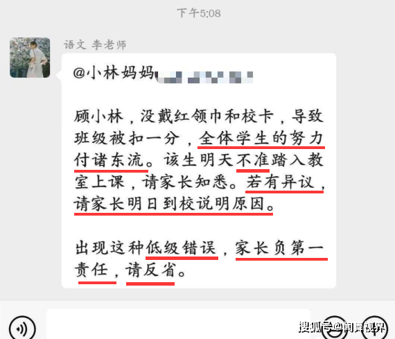 不过,就在最近,某地一所小学的老师因为一名学生忘记戴红领巾和校卡,就在班级群里对这名学生的家长进行公开批评,并要求家长“反省”,如果存在异议,还“请家长明日到校说明原因”,咄咄逼人的气势是不是似曾相识?