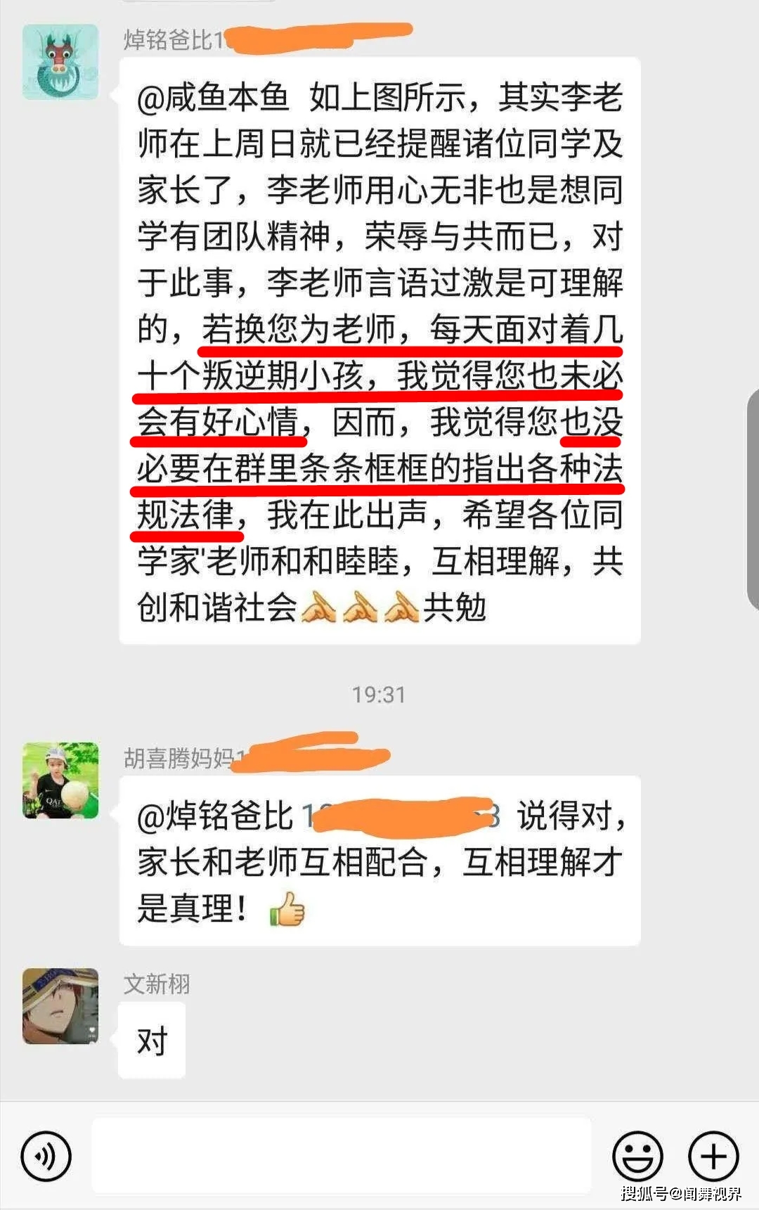 这还不算,在仗义执言家长被踢出群聊后,有家长有习惯性的替老师说话,称老师只是希望培养学生团队精神,言辞过激可以理解,并称“没有必要搬出法律法规吓唬老师”,“应互相理解,和谐共处”。