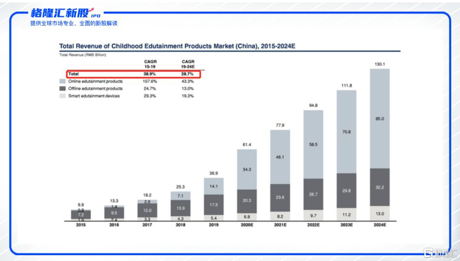洪恩教育主要产品属于儿童寓教于乐型产品。中国该市场规模已从2015年的人民币99亿元增至2019年的人民币369亿元,复合年增长率为38.9%,增速较快。