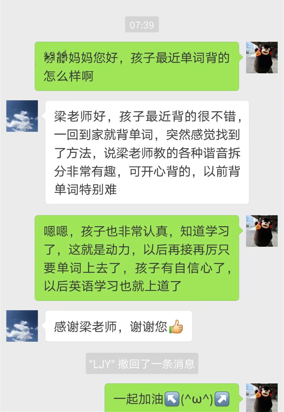 这位孩子的好胜心特别强,对待学习更是如此,遇到不会的问题,一定要在此时此刻弄懂。梁老师了解到情况后,每次上课时都会将自己的口型做的十分夸张,希望孩子可以通过观察自己的口型,更容易地理解所讲授的英语知识。