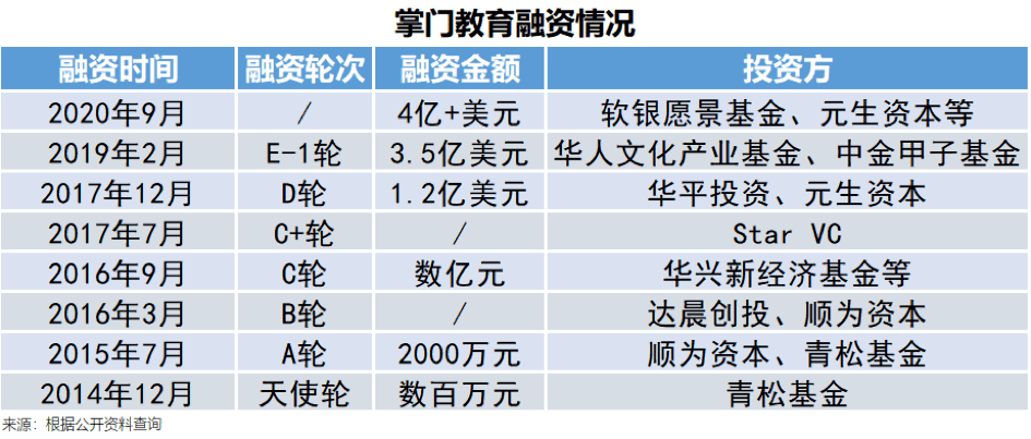 公开资料显示,掌门教育已进行7轮融资,累计达数十亿人民币,上一轮融资是在去年2月的3.5亿美元。当时由华人文化产业基金、中国国际金融有限公司旗下中金甲子基金等机构投资,这笔融资在当时创下了K12在线1对1全科辅导领域的最大融资记录。