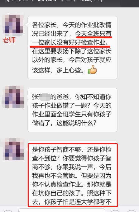 而这天正好有位家长就被点名批评,该家长的孩子只错了一题,可老师的要求是零错误。为此老师在群里怒斥道:张开元的爸爸,你知不知道你孩子作业做错了一题?今天的作业里面全班学生只有你孩子做错了。这能说明什么?是你孩子智商不够,还是你检查不到位?你要觉得你孩子智商不够,你跟我说一声,今后我再也不会管她。但要是因为你不认真检查作业。那你就是在坑你自己的孩子。照这种下去,你孩子怕是连大学都考不起,将来只能读职高了。