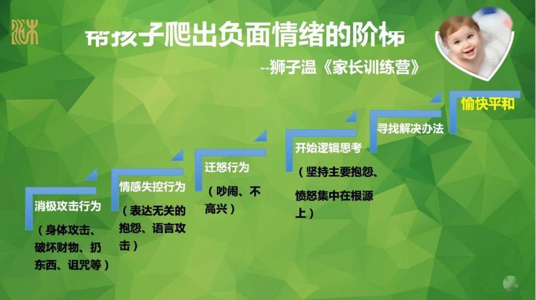 有了心理准备的家长自然稳如泰山,而这种稳定的情绪其实也给了孩子很强的心理暗示:“我在这里陪着你,这事儿没啥大不了。”这种心理暗示往往会很大程度加速孩子爬升阶梯的过程,让孩子尽快从负面情绪中走出来。