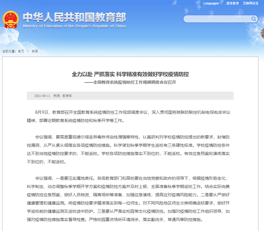 日前,教育部召开全国教育系统疫情防控工作视频调度会议,深入贯彻国务院联防联控机制电视电话会议精神,部署近期教育系统疫情防控和秋季开学等工作。