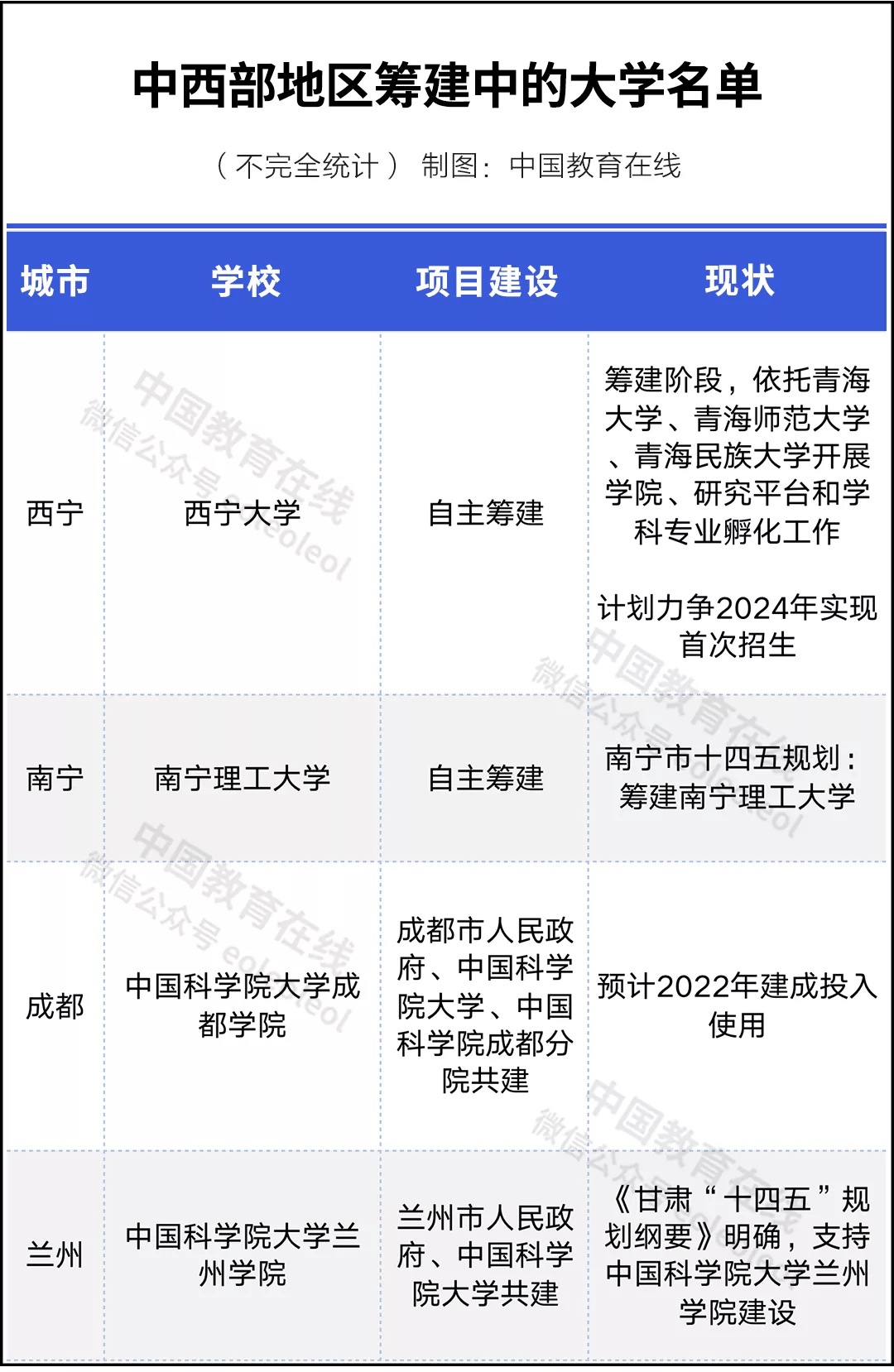 整体来看,中西部新建高校布局相对有限,甘肃省“十四五”规划纲要,明确提出了支持中国科学院大学兰州学院建设,这是中国科学院大学继广州学院、成都学院之后,筹建的又一所高校。
