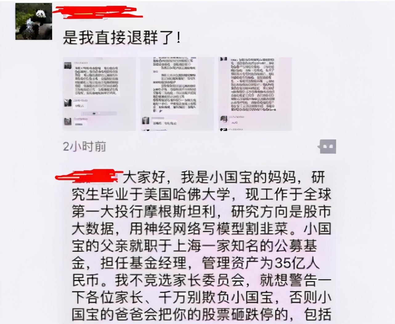 特别是在有了家长群后,个别家长好像找到了炫耀的场所,有事没事就会在群里发一些和学习无关的话,例如假期去了哪玩,买了什么名牌商品,花了多少钱等。