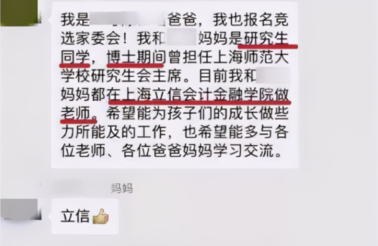 如这位家长,夫妻二人都在上海立信会计金融学院做老师,学识肯定是非常丰富的,还有的家长毕业于外国名牌大学,工作也非常不错,让这些家长进入家委会其他家长也是非常支持的。
