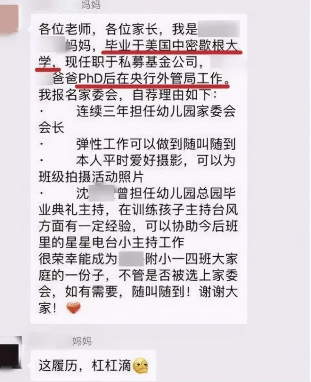这位家长在介绍自己的时候就充分地将自己及家庭的所有优点都展现了出来,她介绍自己是某位小朋友的妈妈,并且介绍了自己在某知名外企做HDR,拥有自由支配的时间及一定的资源。
