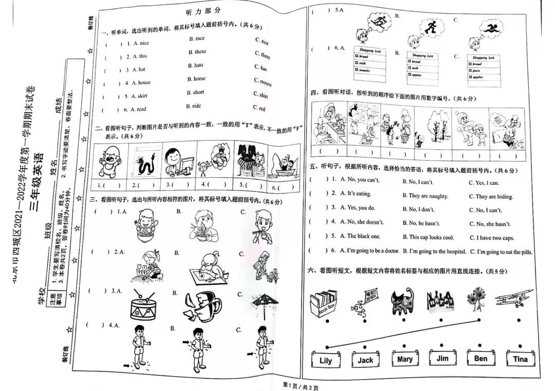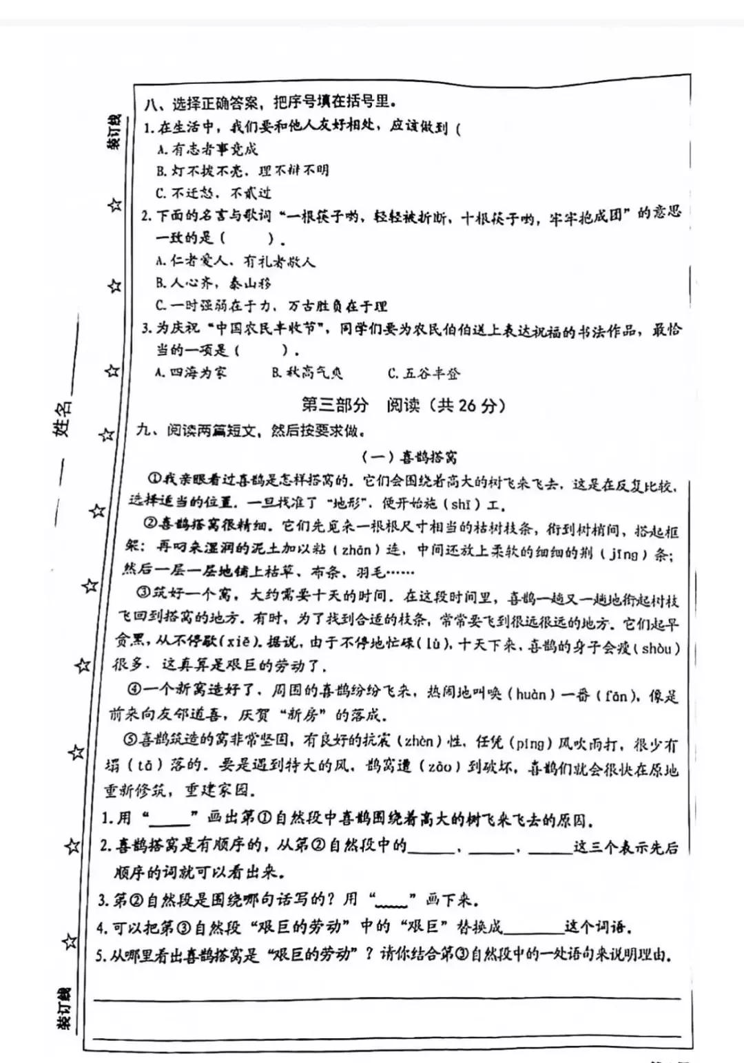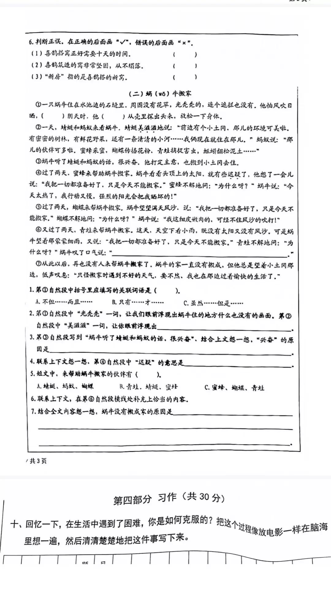 这是西城区三年级的语文期末考试卷节选,两篇阅读理解+一大一小两篇作文。大家可以领会一下精神。