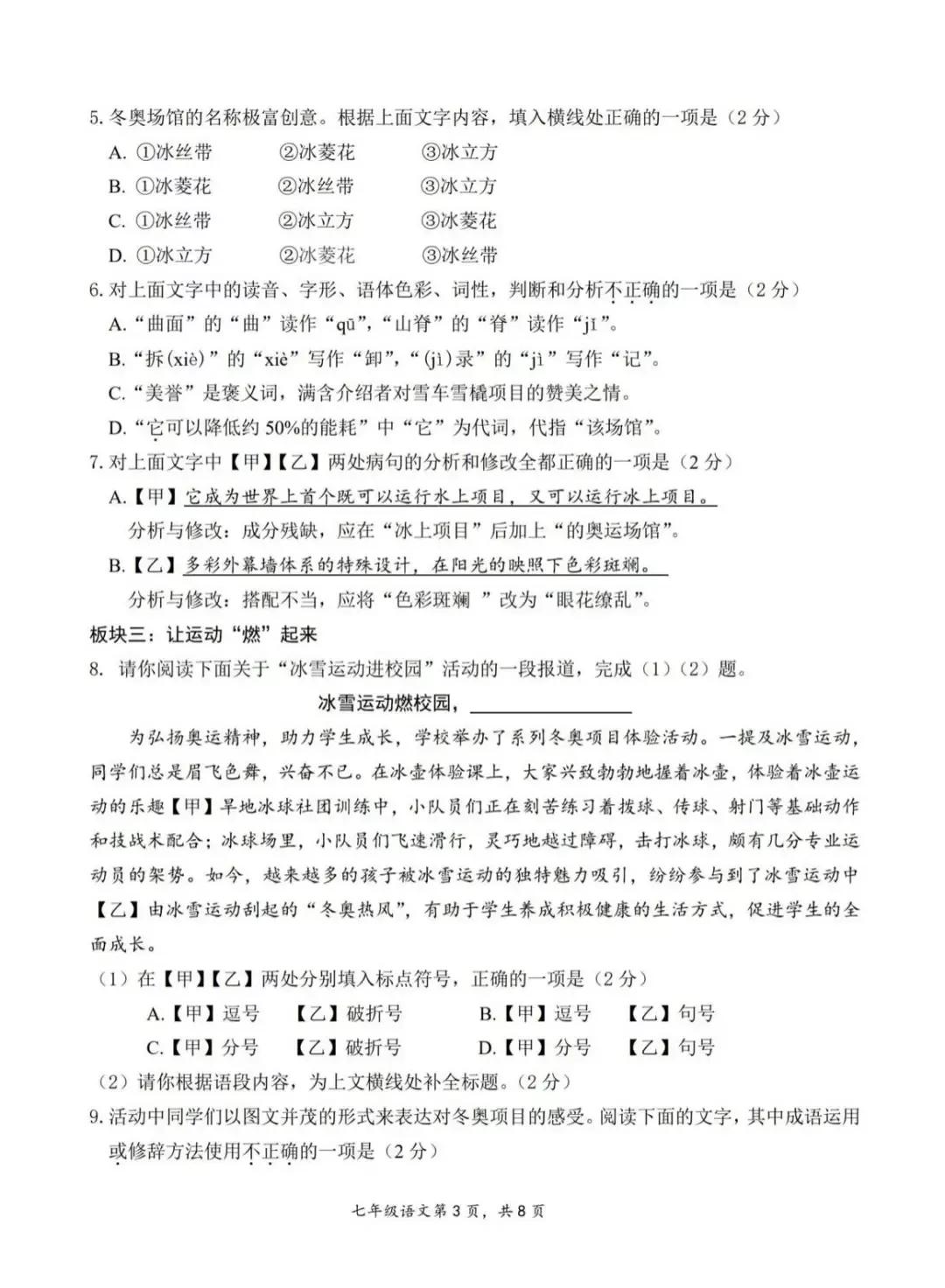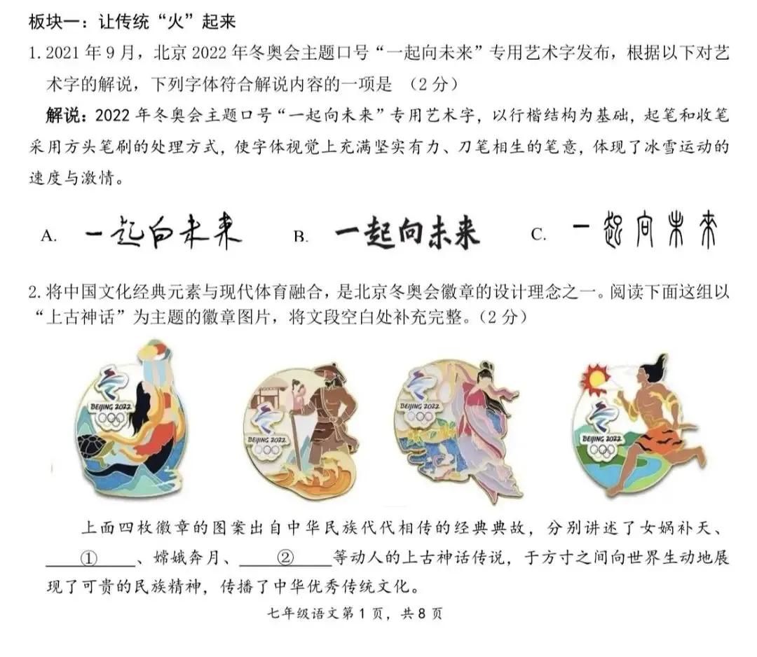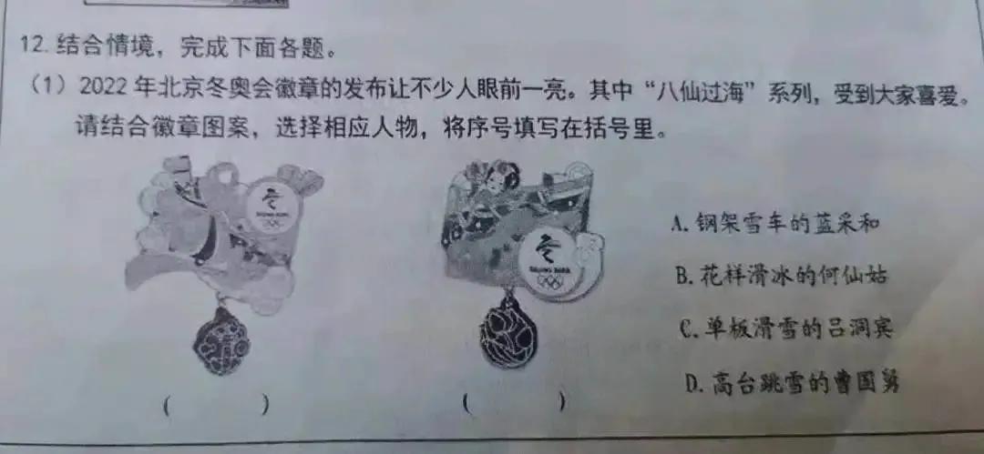 今年最大的时事是什么?自然是冬奥会。西城和海淀不约而同都考了冬奥会的纪念徽章。这是西城考的部分题目:
