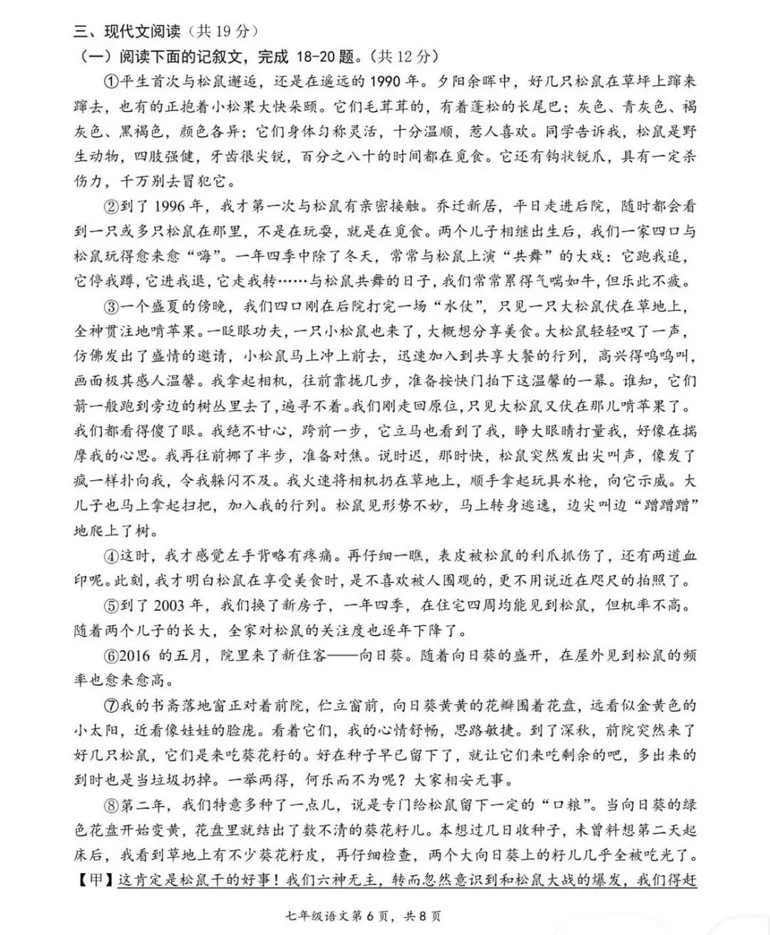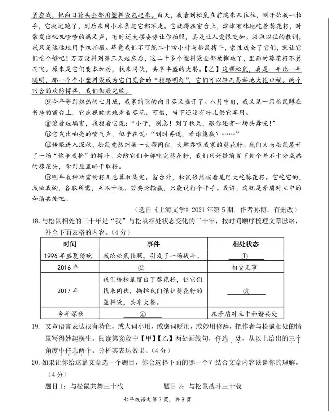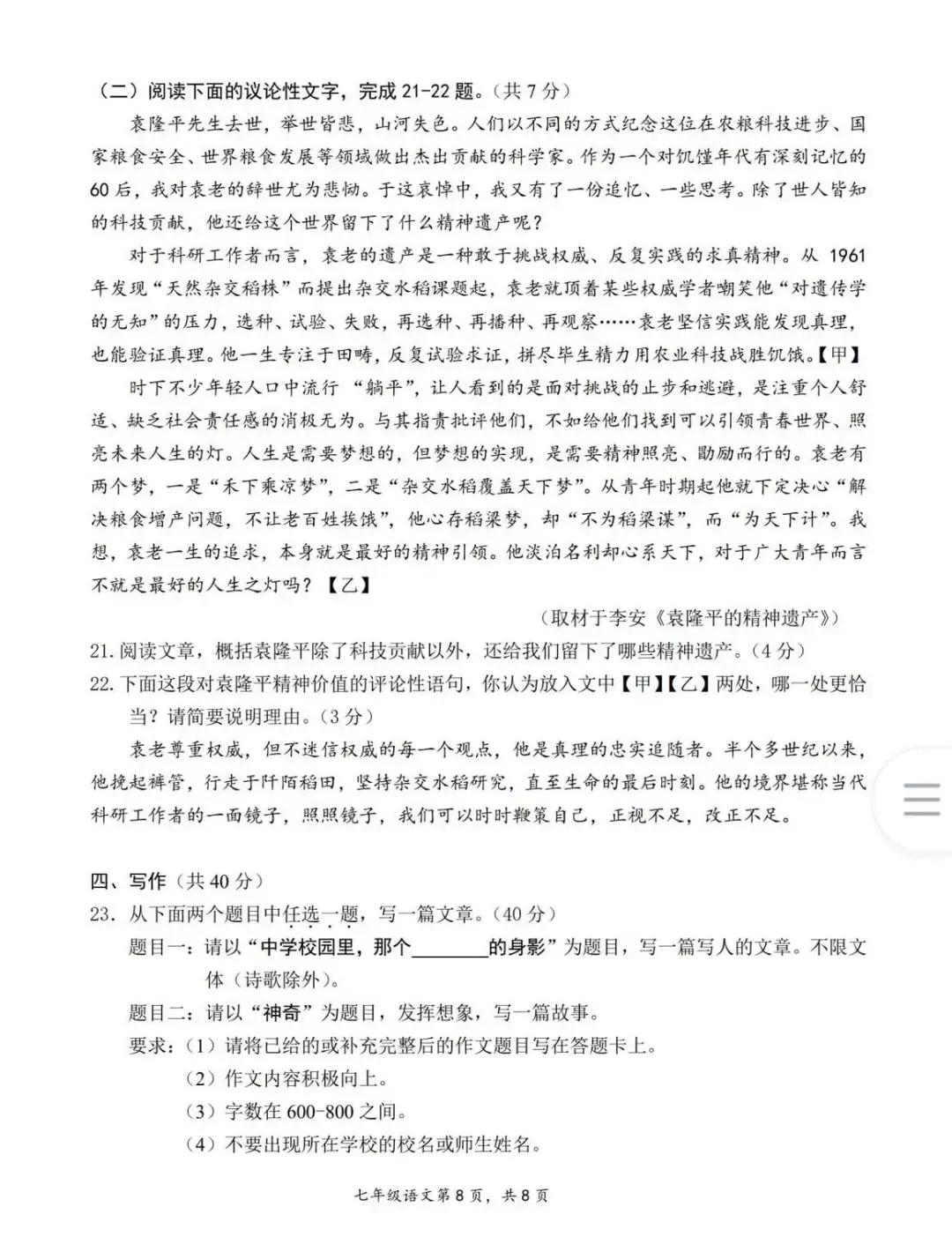 这是海淀区七年级的语文期末考试卷节选,没有基础题,全是阅读+写作。
