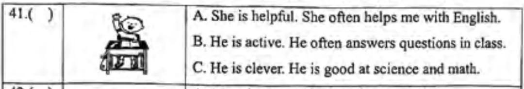 它给出一个学生举手的图片,然后ABC这些选项的文字里会有一些关键字,比如“answer questions”,当扫到这些关键字后,孩子就能明白这段话的意思,以及图片的含义。