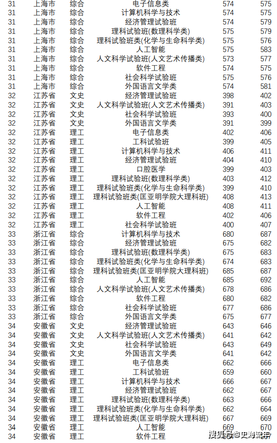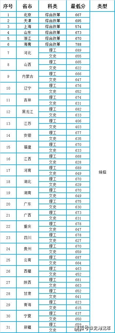 2、2020年,南京大学在内地31个省、市、自治区的录取分数线情况