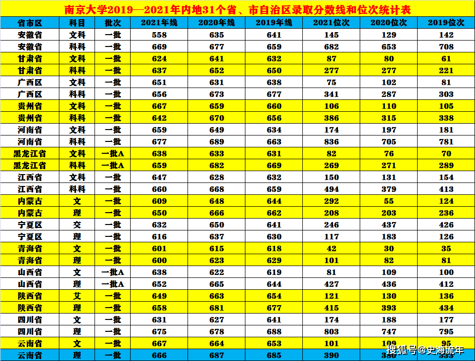 1、2019年,南京大学在内地31个省、市、自治区的录取分数线情况